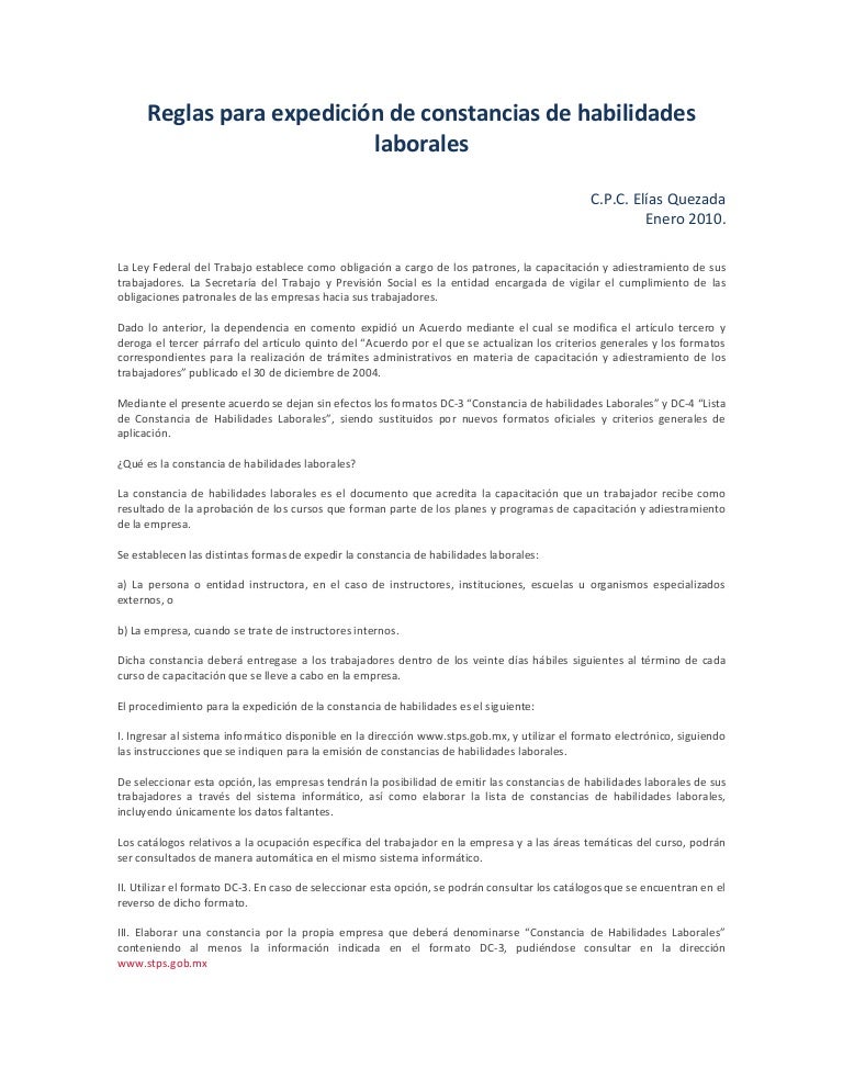 Constancia de competencias o de habilidades laborales formato dc 3 de la stps. La constancia de habilidades laborales es el documento que acredita la capacitación que un trabajador recibe como resultado de la aprobación de los cursos que forman parte de los planes y programas de capacitación y adiestramiento de la empresa. Un documento elaborado por la empresa al que se denominará constancia de competencias o de habilidades laborales y que deberá contener al menos la información del dc 3. Es el papel emitido previa aprobación de las evaluaciones finales de los cursos.