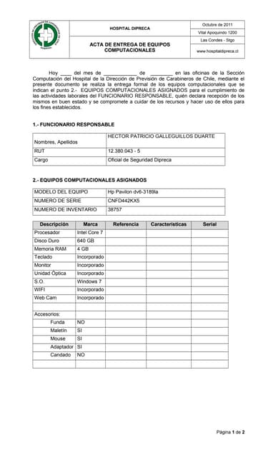 Acta de entrega de equipo celular. Academia edu is a platform for academics to share research papers. La dotacin que a aqu se entrega es y ser de la empresa en todo momento en caso de terminacin del contrato de trabajo o entrega de una nueva dotacin me comprometo a hacer la devolucin de forma inmediata. Acta de entrega de equipo de cómputo.