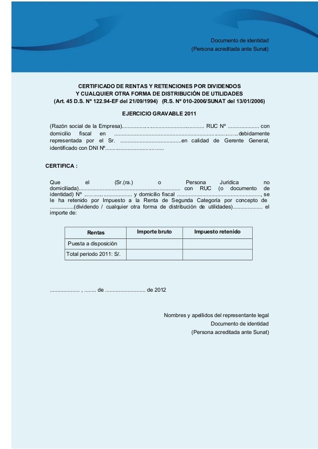 Modelo de certificado de rentas y retenciones por dividendos. Nº 010 2006 sunat del 13 01 2006 ejercicio gravable 2011 razón social de la empresa. A continuación se presenta un modelo del certificado que se expediría a socios o accionistas por el año 2013 y con el cual se daría cumplimiento a lo indicado en el paragrafo 1 del art 42 del decreto 2972 de diciembre 20 de 2013 donde se lee lo siguiente. Y cualquier otra forma de distribución de utilidades art. Certificado de rentas y retenciones antes del 1 de marzo de cada año.